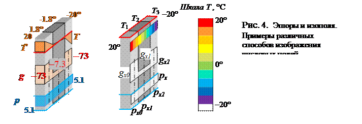 Изобразите наглядно результаты в виде эпюр (графиков) и изополей температуры и теплового потока (рис. 4).