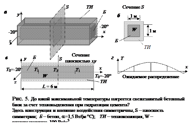 1. Моделирование и расчет. Успеет ли бетонный блок (рис. 5 к задаче 2) разогреться до своих примерно 200 или 300 градусов за те полторы – две недели, когда идет процесс гидратации цемента?В каком месте и какой величины будет максимальная температура через две недели после изготовления блока?