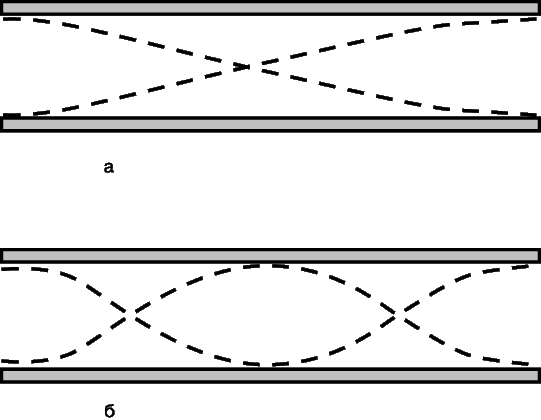 а – основной тон; б – первый обертон. Продольные смещения для наглядности показаны как поперечные.