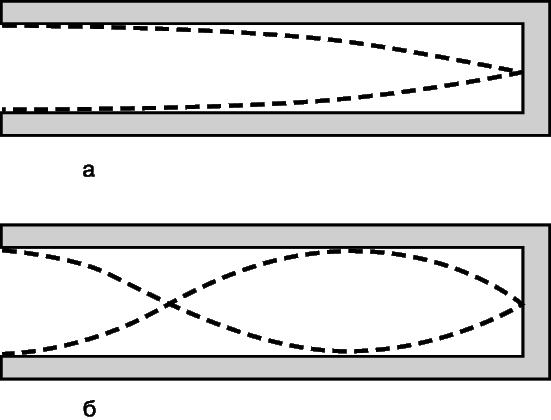 ТИПЫ КОЛЕБАНИЙ трубы, открытой с одного конца: а – основной тон; б – первый обертон.