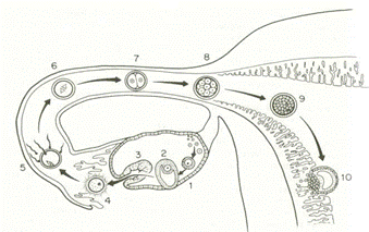 1 – примордиальный фолликул, 2 – зрелый доминантный фолликул, 3 – овуляция, 4 – зрелая яйцеклетка, окруженная лучистым венцом, находящаяся в ампуле маточной трубы, 5 – оплодотворение, 6 – зигота, 7-9 – стадии образования морулы, 10 – имплантация