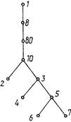 Выбор искусственных опорных баз и формирование соответствующего нового графа размерных связей производится с помощью специально разработанного алгоритма. При этом исходными данными являются ранее сформированный массив графа размерных связей ГРАФ, массив ТКС и ряд справочных массивов, содержащих сведения о припусках на обрабатываемые поверхности базы и признаки вида поверхностей деталей. В результате проектирования по рассматриваемому алгоритму выполняется ряд проверок, устанавливающих необходимость искусственных опорных баз, например, в виде центров с одной или двух сторон детали типа «вал». После выполнения всех проверочных и вычислительных процедур формируется граф размерных связей вала с искусственными опорными базами. Такой граф может быть построен для ранее рассмотренной детали «вал» (рис. 5.5). В этот граф размерных связей введены две искусственные опорные базы (80 и 10) как третий и четвертый элементы массива, получившего название МГОБ (массив графа размерных связей с опорными базами).