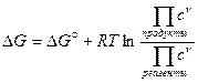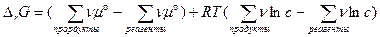 Первое слагаемое обозначаем как DG°, так как оно соответствует концентрациям равным 1, а второе по правилам преобразования логарифмов превращается в логарифм отношения произведений: