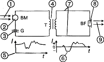 1 - исходные звуковые волны; 2 - микрофон; 3 - батарея питания микрофона; 4 ' - трансформатор; 5 - форма тока в первичной обмотке трансформатора; 6 - форма тока во вторичной обмотке трансформатора; 7 -линия; 8-телефон; 9 - восстановленные звуковые волны