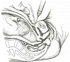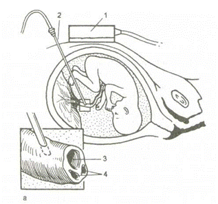 | Амниоцентез, надлобковый доступ | Кордоцентез: 1 – датчик, 2 – пункционная игла, 3 – пупочная вена, 4 – артерии пуповины; |