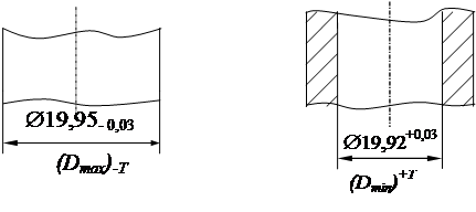 Рабочие (технологические) размеры. На чертежах технологической оснастки разрешается указывать более удобные для рабочего размеры. Рабочий размер состоит из предельного размера, соответствующего максимальному количеству материалла детали (наибольшему предельному для вала и наименьшему предельному для отверстия) и допуска, откладываемого «в тело» детали.