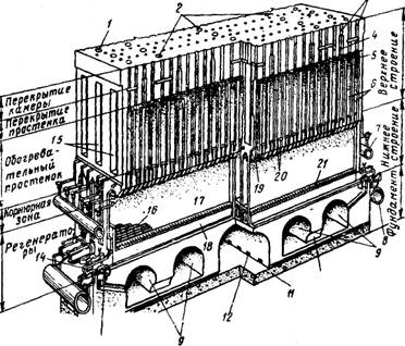 Рисунок 6.3 – Основные конструктивные элементы кладки коксовой батареи: 1 - газоотводящие люки, 2 - загрузочные люки, 3 - смотровые шахточки,. 4 _-перекидной канал, 5 - сборный горизонтальный канал, 6 - вертикал, 7 - газопровод коксового газа, 8 - газопровод доменного газа, 9 - борова, 10 - соединительные окна, 11 - фундаментная плита, 12 - вентиляционный канал, 13 - дымовой канал. 14 - газовоздушный клапан, 15 - камера коксования, 16 - насадка регенератора, 17 - регенератор, 18 - подовый канал; 19 - корнюр, 20 - косые ходы, 21 - колосниковая решетка
