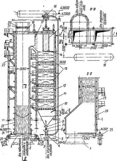 Рис. 6.6 – Общий вид газохода котла-утилизатора конструкции Гипромеза – ТК3: 1-конвертер; 2-ввод циркулирующей воды; 3- воздух от воздуходувки; 4-инжектор; 5-пальцевая задвижка; 6- бункер для дроби; 7-мигалка; 8-сепаратор пыли; 9- к газоочистке;10-заслонки; 11- трубопровод для переносадроби воздухом; 12-экономайзер; 13-испарительные пакеты; 14-полусфера;15 –замедлитель дроби; 16-сепаратор дроби; 17-вертикальный фестон; 18-горизонтальный фестон; 19-барабан; 20- дымовая труба;21- атмосферный шибер; 22-опорные балки; 23-подъёмный газоход; 24- сопла острого дутья;25- полузаслонки;26- место горелки для подтопки