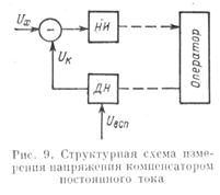 Измерительные устройства с ручным уравновешиванием можно рассматривать как имеющие структурную схему компенсационного преобразования с полной компенсацией. Например, для компенсатора постоянного тока с ручным урав-новешиванием может быть дана структурная схема, показанная на рис. 9, где ДН - делитель напряжения, на котором получается известное падение напряжения U K для компенсации (уравновешивания) неизвестного напряжения U x. Разница U x — U K = D U преобразуется нуль-индикатором НИ в отклонение указателя, которое наблюдается оператором. При отклонении указателя НИ оператор с помощью делителя напряжения изменяет UK до состояния компенсации (U к = U х) и по известному значению U K определяется значение U x. Оператор с делителем напряжения в этом случае выполняет функции интегрирующего звена. Как следует из вышесказанного, нестабильность чувствительности нуль-индикатора в некоторых пределах не вызывает появления погрешности, однако порог чувствительности нуль-индикатора приведет к погрешности.