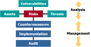На стадии управления рисками, Risk Management, производится поиск адекватных контрмер. По существу речь идет о нахождении варианта системы безопасности, наилучшим образом удовлетворяющей требованиям заказчика. В конце стадии он будет знать, как модифицировать систему в терминах мер уклонения от риска, а также путем выбора специальных мер противодействия, ведущих к снижению или минимизации оставшихся рисков.