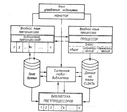 Системная сервис–библиотека – совокупность программ, решающих определенные задачи проектирования, например редактирование исходных данных и управляющих программ, графический контроль геометрической информации УП на графопостроителях или графических дисплеях и др.