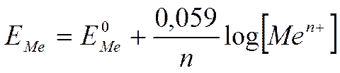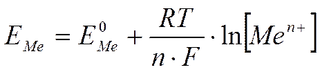 Электродный потенциал Е зависит от концентрации окисленной и восстановленной форм в растворе и температуры и связан с ними и стандартным потенциалом E ° уравнением Нернста: