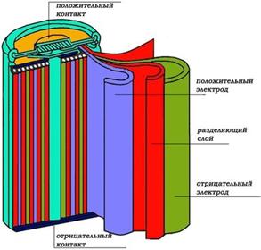 Аккумуляторы этого типа часто называют рулонными, так как электроды скатаны в цилиндр (рулон) вместе с разделяющим слоем, помещены в металлический корпус и залиты электролитом. Разделитель (сепаратор), увлажненный электролитом, изолирует пластины друг от друга. Он изготавливается из нетканого материала, который должен быть устойчив к воздействию щелочи. Электролитом чаще всего выступает гидроксид калия KOH с добавкой гидроксида лития LiOH, способствующего образованию никелатов лития и увеличения емкости на 20%.