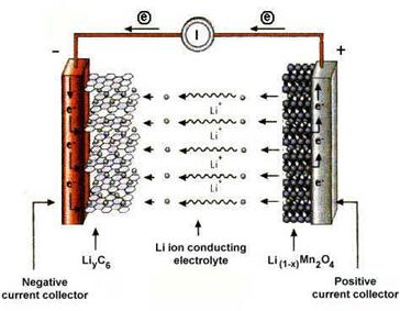 В литий-ионных элементах ионы лития связаны молекулами других материалов. Типичный
