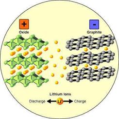При разряде аккумулятора на положительном электроде происходит интеркаляция лития в оксид и деинтеркаляция из углеродного материала на отрицательном. Таким образом, процессы заряда-разряда сводятся к переносу ионов лития с одного электрода на другой, отсюда и название "литий-ионные" аккумуляторы.