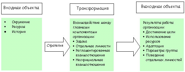 В настоящее время сформировался взгляд на организацию как на сложную открытую социальную систему, механизм, берущий элементы входа из внешнего по отношению к организации окружения и подвергающий их различным преобразованиям, в результате чего получаются элементы выхода (Рис.7.2).