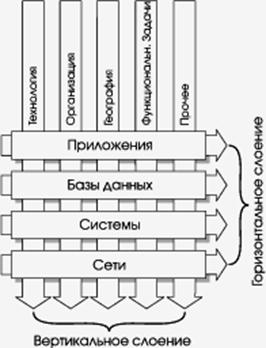 Горизонтальное слоение информационной системы соответствует традиционному технологическому делению на приложения, базовые сервисы, системы и сети. Вертикальное — отражает скорее нетехнические аспекты — организационную структуру, территориальное размещение, функциональные задачи и т.п.; в принципе оно позволяет связывать управляемые объекты с бизнес-процессами и, тем самым, помогает найти общий язык управленцам и системным администраторам.