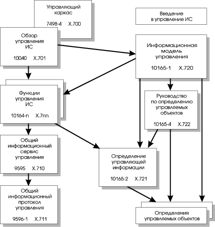Соответственно группируются и стандарты семейства X.700. На рисунке приведены основные стандарты и связи между ними. Целесообразно и в документации на коммерческие продукты выделять аналогичные компоненты.