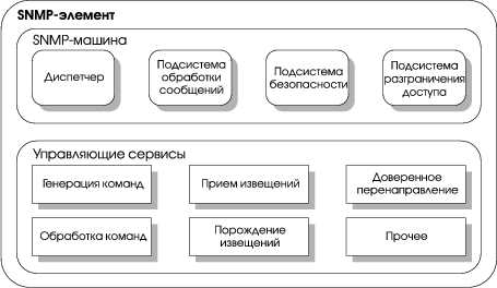 SNMP-машина присутствует во всех управляемых и управляющих компонентах. Она включает четыре компонента:
