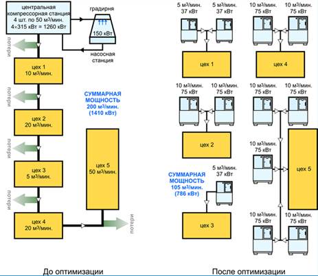 Рисунок 8.4 - Схема воздухоснабжения: (до оптимизации) - это централизованная и (после оптимизации) - децентрализованная схемы