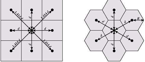 При проектировании такой системы первое, что нужно сделать, — это решить, какую форму должны иметь ячейки, на которые будет разбита зона обслуживания. Самым простым решением была бы сетка, состоящая из квадратных ячеек (рис. 1, а). Однако такая геометрическая форма оказалась не идеальной. Если сторона квадратной ячейки равна d, тогда ячейка будет иметь четыре соседа на расстоянии d и четыре — на расстоянии -