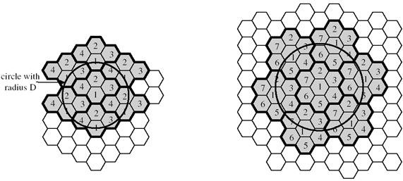 Важным вопросом, разумеется, является определение удаленности двух ячеек, использующих одну частоту, поскольку сигналы этих ячеек не должны интерферировать друг с другом. Были предложены различные модели многократного использования частот, некоторые примеры приведены на рис. 2. Если схема состоит из N ячеек, для которых выделяется одинаковое количество частот, то каждая ячейка будет иметь K/N частот, где К — общее число частот, выделяемых системе.