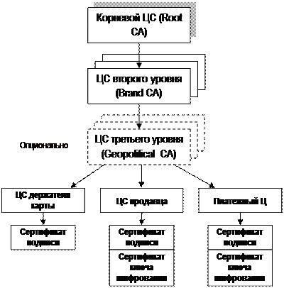 На следующем уровне иерархии находятся брендовые ЦС, включающие различные организации по управлению банковскими картами (главным образом Visa и MasterCard), а также кредитными картами, такими, как American Express. Эти центры могут делегировать свои полномочия в выбранной зоне геополитическим ЦС, чья функция заключается в аккредитации локальных центров. Отметим, что для всех этих ЦС длина ключа для криптоалгоритмов с открытым ключом равна 1024 битам.