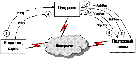 В простейшем случае обмен сообщениями содержит сообщения PReq, AuthReq, AuthRes, PRes, CapReq и CapRes (рис. 13). Сообщениями PReq и PRes обмениваются продавец и владелец карты, тогда как остальными сообщениями ‑ продавец и платежный шлюз.