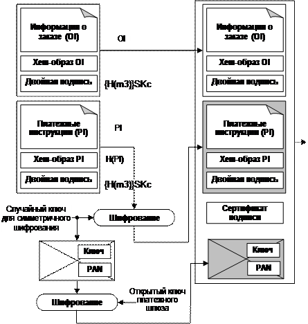 Данные заказа и платежная инструкция. Данные ордера заказа (order information, OI) и платежные инструкции (payment instruction, PI) передаются в сообщении PReq. Данные заказа определяют заказанные товары, платежная инструкция содержит PAN, цену предметов и идентификатор заказа TransID, если он поддерживается продавцом. В противном случае идентификатор транзакции формирует ПО на стороне владельца карты.