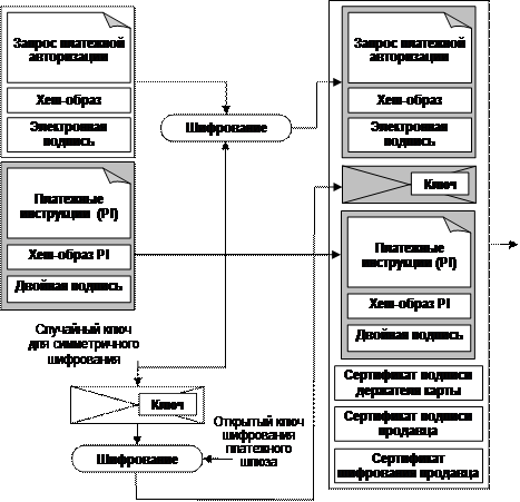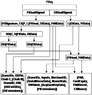 Платежная инструкция вместе с дайджестом и двойной подписью передаются после шифрования случайным секретным ключом. Этот ключ в свою очередь шифруется открытым ключом шифрования ключей платежного шлюза, что делает его недоступным для продавца. Если владелец карты имеет сертификат подписи, он также пересылается. На рис. 15 отражена структура сообщения PReq, одного из наиболее сложных сообщений протокола.