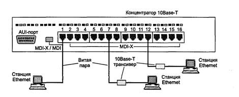 С появлением спецификации 10Base-T для витой пары повторитель стал неотъемлемой частью сети Ethernet, так как без него связь можно было организовать только между двумя узлами сети. Многопортовые повторители Ethernet на витой паре стали называть концентраторами или хабами, так как в одном устройстве действительно концентрировались связи между большим количеством узлов сети. Концентратор Ethernet обычно имеет от 8 до 72 портов, причем основная часть портов предназначена для подключения кабелей на витой паре. На рис.2.13 показан типичный концентратор Ethernet, рассчитанный на образование небольших сегментов разделяемой среды. Он имеет 16 портов стандарта 10Base-T с разъемами RJ-45, а также один порт AUI для подключения внешнего трансивера. Обычно к этому порту подключается трансивер, работающий на коаксиал или оптоволокно. С помощью этого трансивера концентратор подключается к магистральному кабелю, соединяющему несколько концентраторов между собой, либо таким образом обеспечивается подключение станции, удаленной от концентратора более чем на 100 м.
