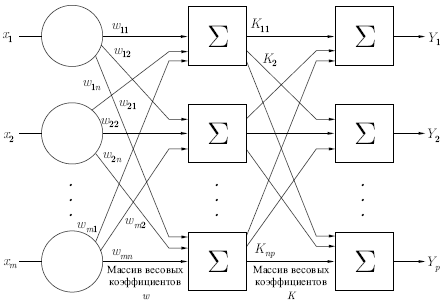 К сожалению, нет общепринятого способа подсчета числа слоев в сети. Многослойная сеть состоит, как показано на рис. 1.6, из чередующихся множеств нейронов и весов. Ранее, в связи с рис. 1.5, уже говорилось, что входной слой не выполняет суммирования. Эти нейроны служат лишь в качестве разветвлений для первого множества весов и не влияют на вычислительные возможности сети. По этой причине первый слой не принимается во внимание при подсчете слоев, и сеть, подобная изображенной на рисунке 1.6, считается двуслойной, так как только два слоя выполняют вычисления. Далее, веса слоя считаются связанными со следующими за ними нейронами. Следовательно, слой состоит из множества весов со следующими за ними нейронами, суммирующими взвешенные сигналы.