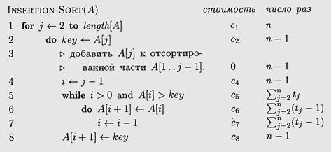 Для вычисления суммарного времени выполнения процедуры Insertion-Sort отметим около каждой строки её стоимость (число операций) и число раз, которое эта строка исполняется. Для каждого j от 2 до п (здесь п = length [ A ]– размер массива) требуется подсчитать, сколько раз будет исполнена строка 5, обозначим это число через t j. Строки внутри цикла выполняются на один раз меньше, чем проверка, поскольку последняя проверка выводит из цикла. Строка стоимостью c, повторённая т раз, даёт вклад c× m в общее число операций (однако, это выражение нельзя использовать для оценки количества использованной памяти). Сложив вклады всех строк, получим