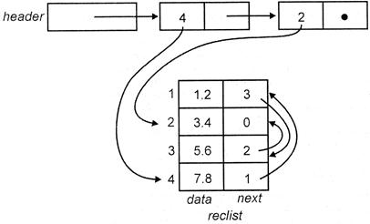 задает имя reclist (список записей) четырехэлементного массива, значениями которого являются записи с двумя полями: data (данные) и next (следующий).