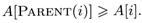 Элемент А [1] является корнем дерева. В большинстве компьютеров для выполнения процедур Left и Parent можно использовать команды левого и правого сдвига (Left, Parent); Right требует левого сдвига, после которого в младший разряд помещается единица. Элементы, хранящиеся в куче, должны обладать основным свойством кучи (heap property): для каждой вершины i, кроме корня (т.е. при 2 ≤ i ≤ heap-size [ A ]),