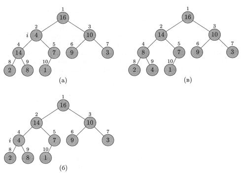 На рисунке 2.4 (а) отображено начальное состояние кучи. В вершине i = 2 основное свойство нарушено. Чтобы восстановить его, необходимо поменять А [2]и А [4]. После этого (б) основное свойство нарушается в вершине с индексом 4. Рекурсивный вызов процедуры Heapify(A, 4) восстанавливает основное свойство в вершине с индексом 4 путём перестановки А [ 4 ] ↔ А [ 9 ](в). После этого основное свойство выполнено для всех вершин, так что процедура Heapify(A, 9) уже ничего не делает.
