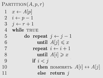 Основной шаг алгоритма – процедура Partition, которая переставляет элементы массива А [ р..r ]нужным образом: