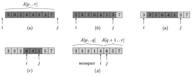 Незакрашенные элементы относятся к уже сформированным фрагментам, закрашенные ещё не распределены. (а) Начальное состояние массива, начальный и конечный куски пусты. Элемент х = А [ р ]= 5 используется в качестве граничного. (б) Результат первого прохода цикла while (строки 4-8). (в) Элементы А [ i ]и A [ j ]меняются местами (строка 10). (г) Результат второго прохода цикла while. (д) Результат третьего (последнего) прохода цикла while. Поскольку i ≥ j, процедура останавливается и возвращает значение q = j. Элементы слева от A [ j ](включая сам этот элемент) не больше, чем х = 5, а элементы справа от A [ j ]не меньше, чем х = 5.
