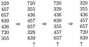 Как ни странно, оказывается удобнее начать с младшего разряда, разложив колоду на 10 стопок в зависимости от того, где пробито отверстие в «младшем» столбце. Полученные 10 стопок надо после этого сложить в одну в таком порядке: сначала карты с 0, затем карты с 1, и т. д. Получившуюся колоду вновь рассортируем на 10 стопок, но уже в соответствии с разрядом десятков, сложим полученные стопки в одну колоду, и т. д.; если на перфокартах были записаны «d - значные числа, то понадобится d раз воспользоваться сортировочной машиной. На рис. 2.9 показано, как действует этот алгоритм, примененный к семи трёхзначным числам.