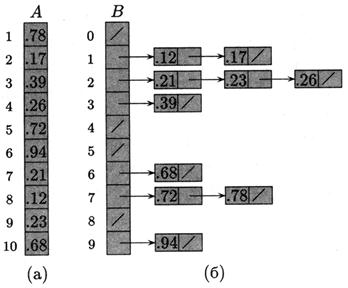 (а) На вход подан массив А [1..10]. (б) Массив списков В [0..9] после выполнения строки 5. Список с индексом i содержит числа, у которых первый знак после запятой есть i. Отсортированный массив получится, если последовательно выписать списки В [ 0 ] ,...,В [ 9 ].
