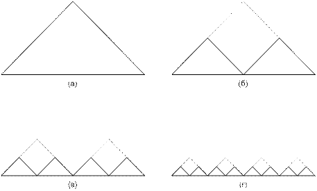 В применяемой геометрической интерпретации размер входа алгоритма сортировки для каждого из карманов будет представляться периметром треугольника, а затраты процессорного времени – его площадью (рис. 2.11, (а)). Если количество карманов будет увеличено вдвое, то затраты процессорного времени будут складываться из затрат на сортировку в каждом из карманов вдвое меньшего размера (рис. 2.11, (б)) и так далее.