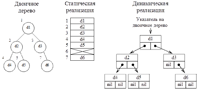 Двоичное дерево можно реализовывать как статическую структуру данных в виде одномерного массива, а можно как динамическую структуру – в виде списка.
