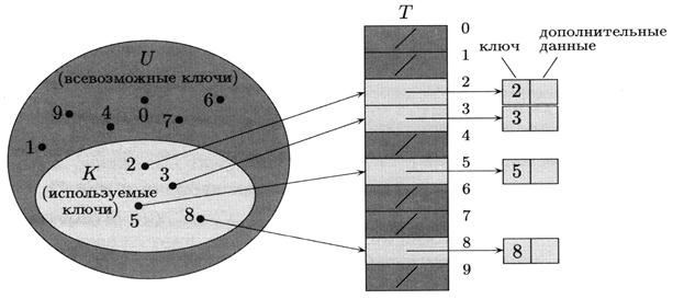 Прямая адресация применима, если количество возможных ключей невелико. Пусть возможными ключами являются числа из множества U = {0,1,...,m – 1} (число т не очень велико). Предположим также, что ключи всех элементов различны.