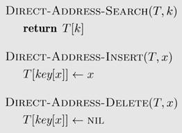 T [ k ] – место, предназначенное для записи указателя на элемент с ключом k; если элемента с ключом k в таблице нет, то T [ k ] = NIL). Реализация словарных операций тривиальна: