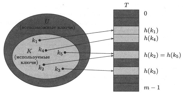 – некоторая функция, называемая хеш-функцией (hash function). Число h (k)называют хеш-значением (hash value) ключа k. Использование массива длины т, а не | U|,дает экономию памяти.