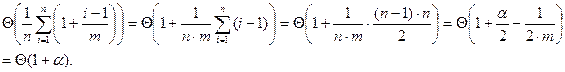 Теперь вспомним об усреднении по различным возможностям в процессе построения таблицы. При добавлении в неё i -го элемента математическое ожидание числа действий равно Θ(1 + (i – 1) / m) (см. доказательство предыдущей теоремы), и потому математическое ожидание общего числа действий при заполнении таблицы, делённое на n, есть