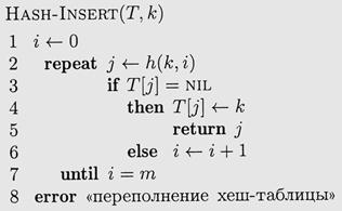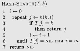 Вот текст процедуры поиска hash-search(если элемент с ключом k содержится в таблице Т в позиции j, процедура возвращает j, в противном случае она возвращает nil).