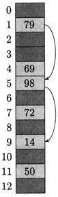 Рисунку 4.6 соответствует m = 13, h 1(k) = k mod 13, h 2(k) = 1+ (k mod 11). При выбранном k = 14 последовательность проб будет такая: 1-я и 5-я ячейки заняты, 9-я свободна, элемент «14» помещается туда.
