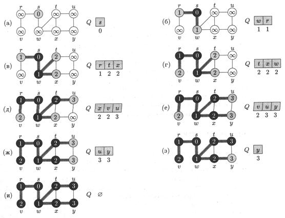 в строке 8 вершина s помещается в очередь Q, и с этого момента очередь будет