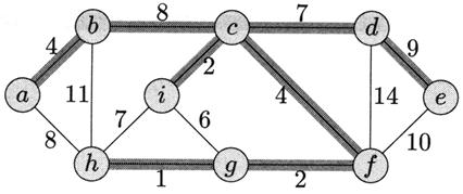 На рис. 5.6 изображено минимальное покрывающее дерево. На каждом ребре графа указан вес. Выделены рёбра минимального покрывающего дерева (суммарный вес 37). Такое